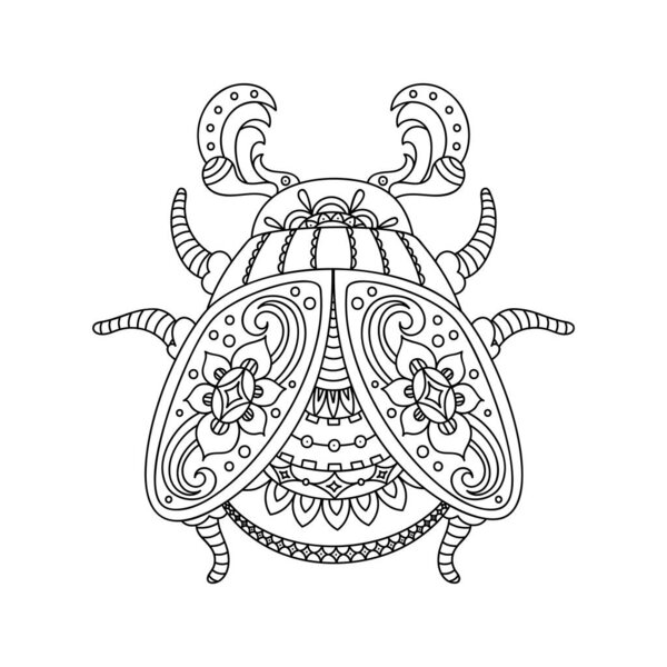 828322468 Single ornamental beetle coloring page with intricate mandala-style details, black and white vector for adults and kids