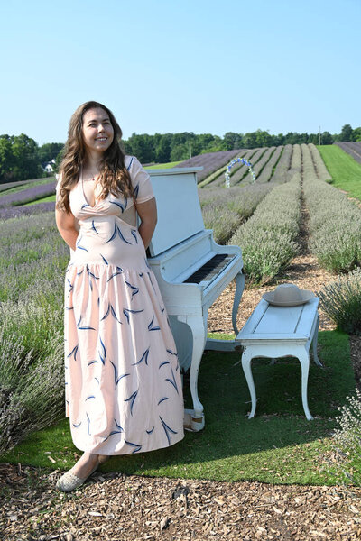 737727626 Woman in hat in lavender field and white piano