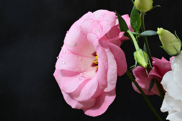 842040066 Soft white and pink eustoma flowers on black background.
