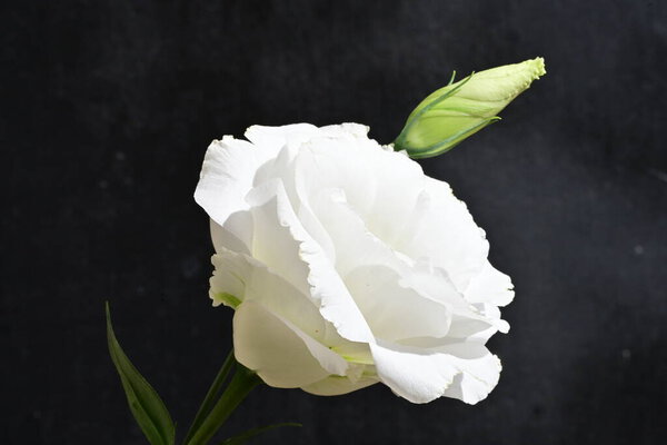 842041546 Tender white eustoma blooms against black background.