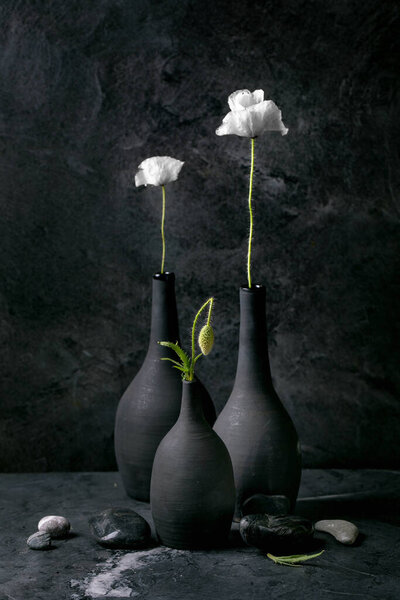808106004 Minimalist still life with white poppy flowers and poppy bud in black ceramic vases against dark textured background. Elegant moody composition with pebbles.