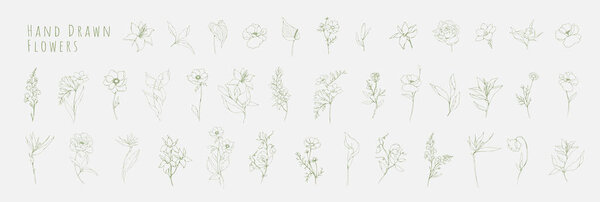 797733534 Botanic set of linear hand drawn flowers and brunch. Luxury vintage floral collection for wedding invitation, wallpaper art or save the date card. Botanical vector illustration, line herbs