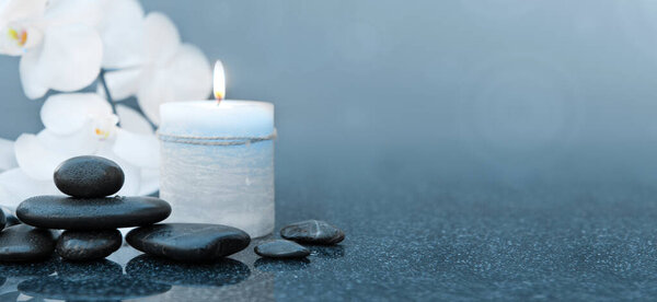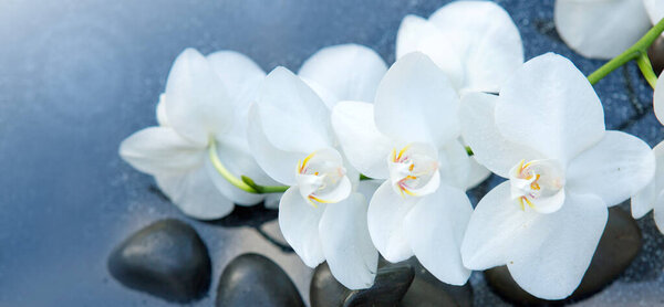 742844136 Spa stones with white orchid flowers.Black stones on a gray background, space for a text .