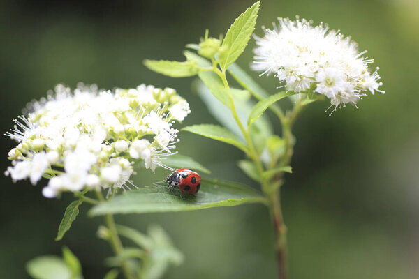 681500204 A ladybug on a white flower with green leaves