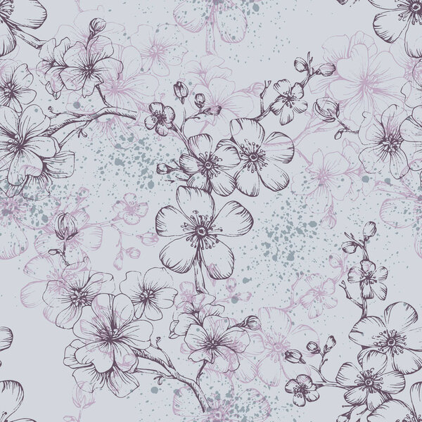 654236180 Seamless pattern with cherry tree blossom. Vintage hand drawn vector illustration in sketch style. Pink cherry flowers textile print, spring tree blossom fabric, rosy simple flowers.