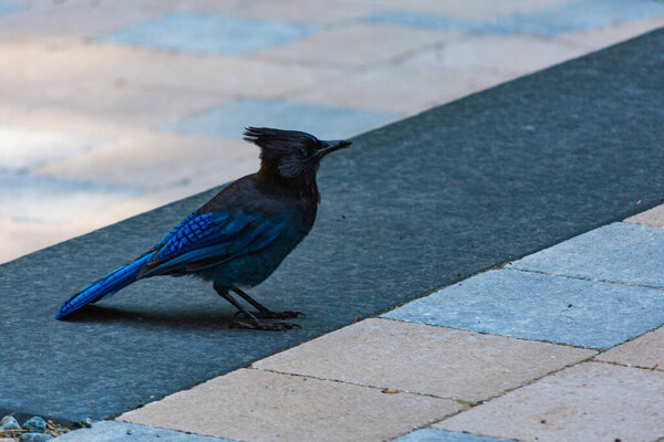 581859654 A closeup of a beautiful blue jay on a ground with colorful tiles