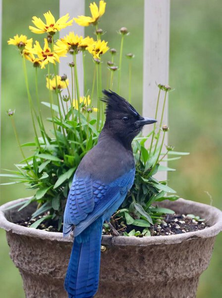 595795936 A vertical closeup shot of a blue steller's jay perched on a potted plant