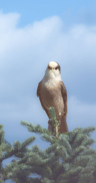 691279000 Nice specimen of a gray jay perched in a tree in the mountains in Quebec, Canada