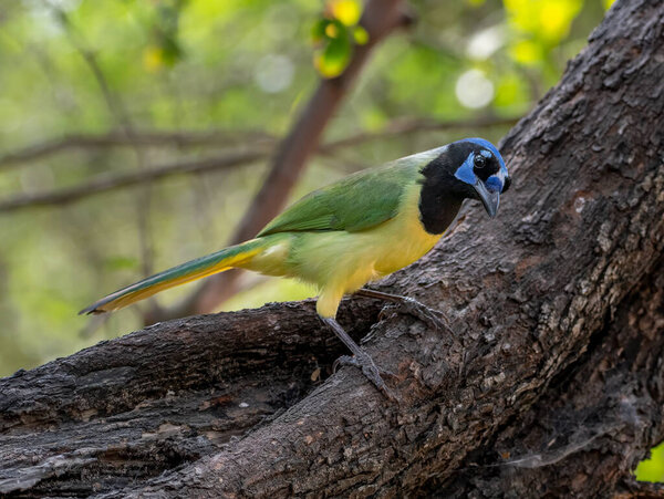 765683280 A beautiful and vibrantly colored Green Jay perches momentarily as it approaches a south Texas feeding station.