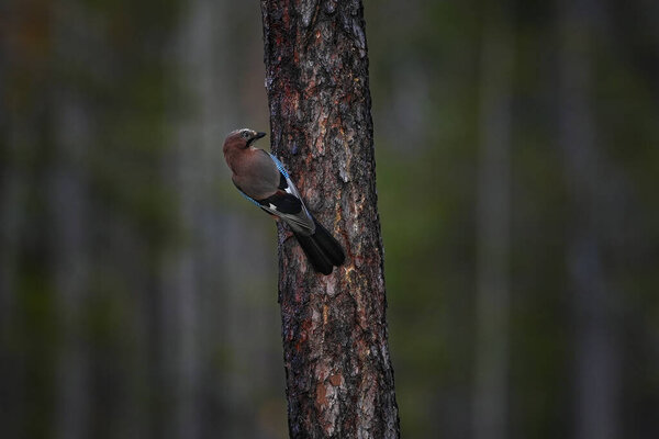 764363656 Finland wildlife. Close-up portrait of beautiful jay. Portrait of nice bird Eurasian Jay, Garrulus glandarius, sitting on old tree stump.