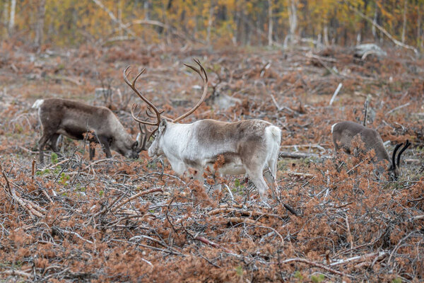 626346240 Reindeer Rangifer tarandus Herd and young calf spotted in northern part of Swedish Lappland Sweden jokkmokk.