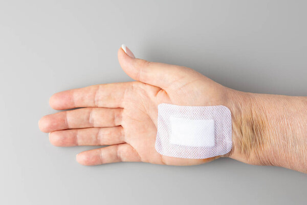 853562436 Special medical adhesive plaster to healing and security fresh scar after carpal tunnel syndrome surgery on woman's hand. Scar care. Female hand lying on grey neutral background