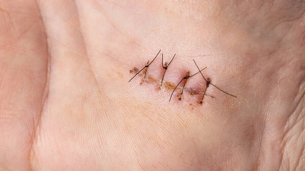 646721864 The left hand of female after open carpal tunnel release surgery on blue surgical drape with surgical incision.The stitches remained in palm after surgery that prepare for removal.Median nerve injury.