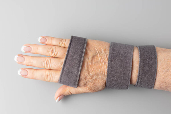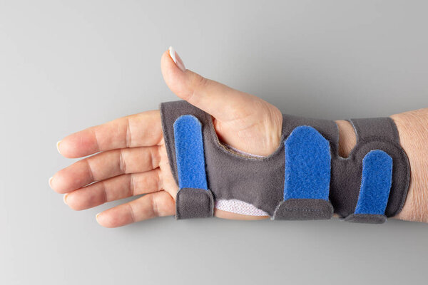 853562448 Wrist support brace for surgery, injury recovery or pain relief. Orthopedic healthcare concept, treatment wrist inflammation and rehabilitation. Female hand with orthosis lying on grey background.