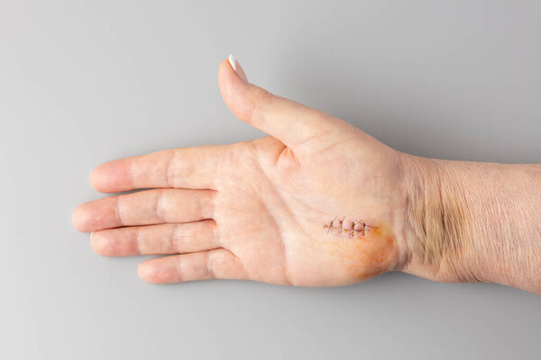 853562450 Fresh healing scar one week after surgery on tendons and nerve, Carpal tunnel syndrome treatment. Scar care. Female hand lying on grey neutral background