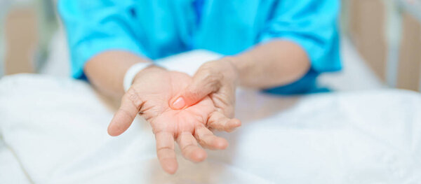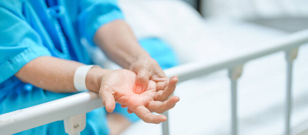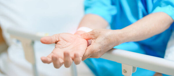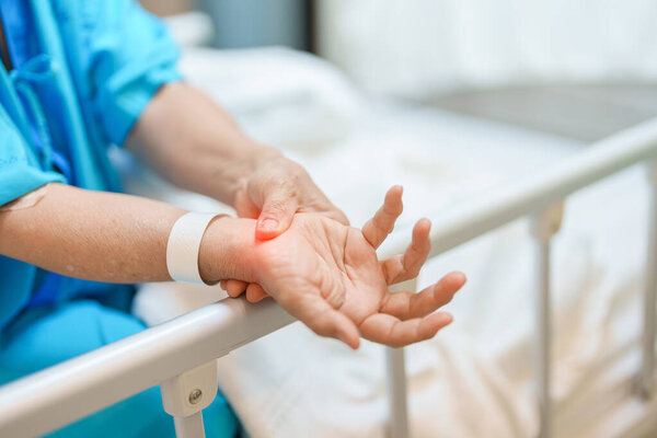 795422066 Elderly Patient Woman having wrist pain in hospital, muscle ache due to Carpal Tunnel Syndrome, De Quervain s tenosynovitis, rheumatoid, arthritis, gout, Parkinson disease and ergonomic healthcare