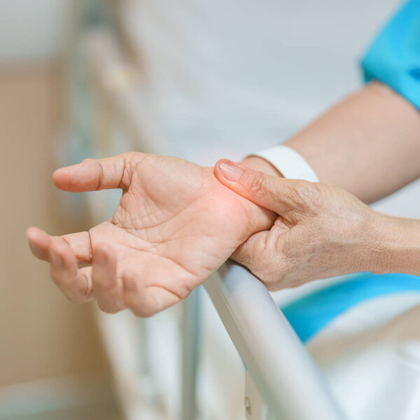 794699774 Elderly Patient Woman having wrist pain in hospital, muscle ache due to Carpal Tunnel Syndrome, De Quervain s tenosynovitis, rheumatoid, arthritis, gout, Parkinson disease and ergonomic healthcare