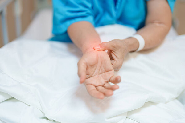 794699866 Elderly Patient Woman having wrist pain in hospital, muscle ache due to Carpal Tunnel Syndrome, De Quervain s tenosynovitis, rheumatoid, arthritis, gout, Parkinson disease and ergonomic healthcare