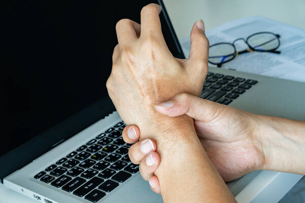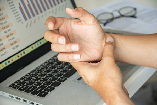 828362644 Wrist strain from prolonged laptop use, likely due to repetitive movements. Surrounded by financial data, glasses, and paperwork in a workspace setting. Office syndrome concept.