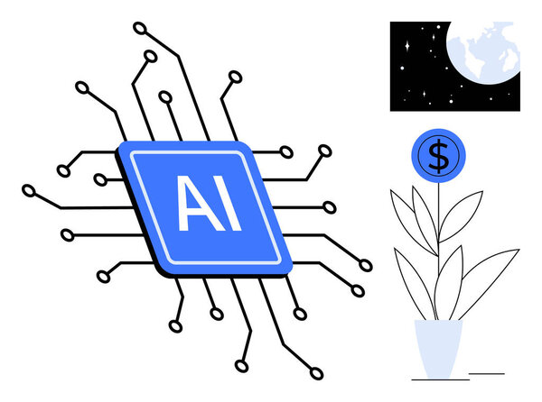 848658178 Blue AI chip with circuit lines, potted plant with dollar sign, and moonlit Earth. Ideal for AI, technology, sustainability, economic growth, innovation connectivity futuristic concepts. Simple