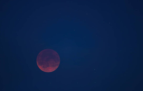 838192178 Red total lunar eclipse glowing in the dark night sky with visible stars