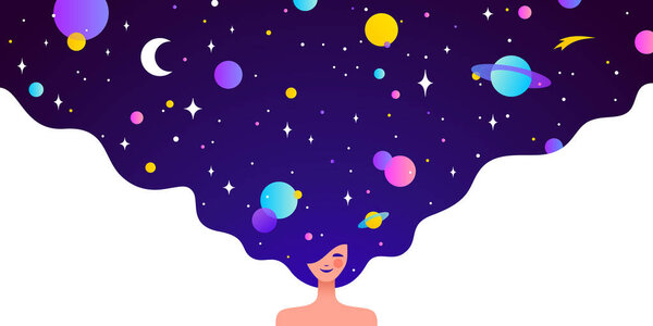 841421872 Dream universe flows through woman figure, girl with cosmic night sky in hair. Woman dream vision shines, girl in flat style, universe dream surrounds woman girl cosmos. Vector Illustration