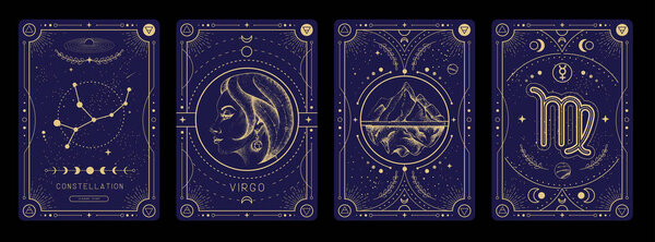 698110718 Set of Modern magic witchcraft cards with astrology Virgo zodiac sign characteristic. Vector illustration