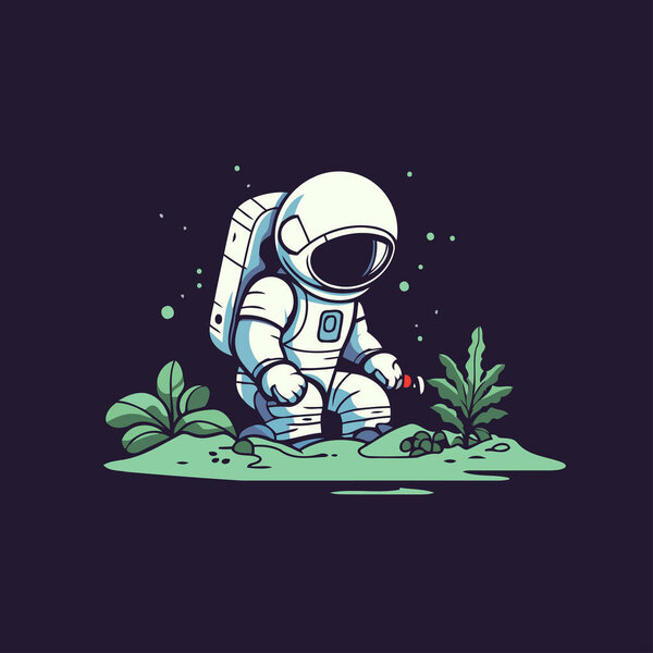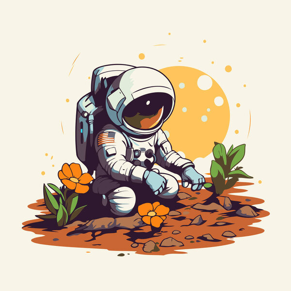 704649664 Astronaut sitting on the ground with flowers. Vector illustration.