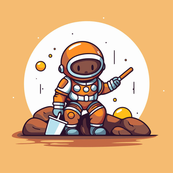 704876890 Astronaut sitting on a stone and holding a bucket. Vector illustration.