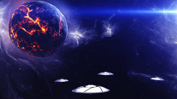 717835004 Alien flying saucer fleet in deep space near dead planet3d rendering of alien world concept, 4K, 2024