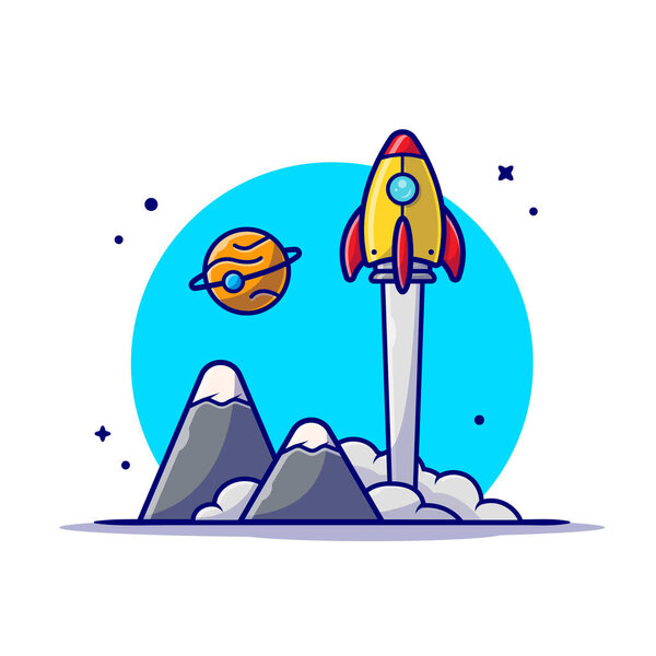 660508586 Space Shuttle Taking Off with Planet and Mountain Space Cartoon Vector Icon Illustration. Science Technology Icon Concept Isolated Premium Vector. Flat Cartoon Style
