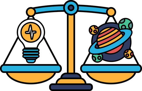 786660316 A scale with a light bulb on one side and a planet on the other. The light bulb represents an idea, while the planet represents the universe. The scale is balanced
