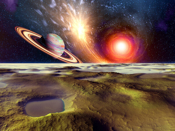 681494336 2d creative illustration of beautiful sci fi space planet landscape with Saturn on background