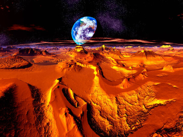 681494862 2d creative illustration of beautiful sci fi space planet landscape with earth on background