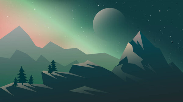 684083702 Starry night sky and moon. Mountains at the northern lights landscape. Vector illustration nature a mountain landscape