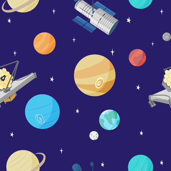 730673168 All the Planets of the Solar System and Space Telescopes on the Night Sky. Seamless pattern. Vector illustration for wrapping paper, background, print.