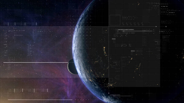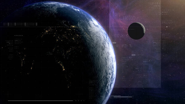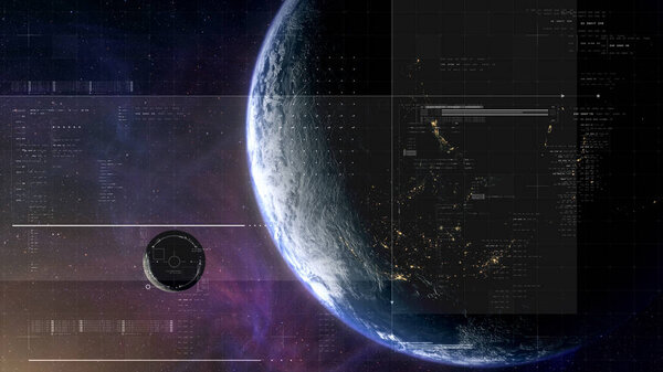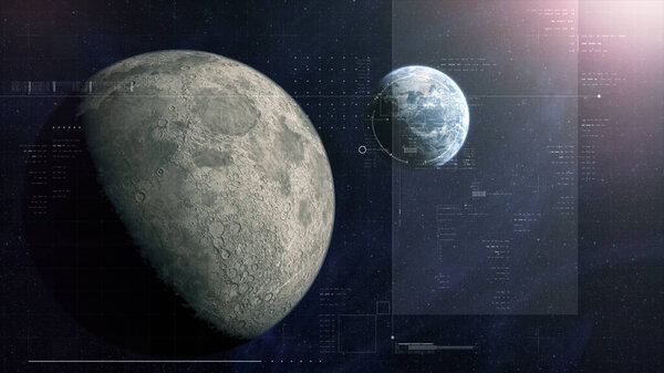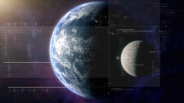 862888384 Cinematic view of Earth and Moon from space with a clean futuristic HUD overlay, blending real planetary detail with sci-fi interface elements for aerospace, surveillance, and exploration themes