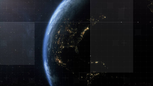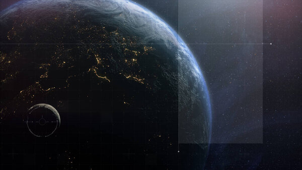 862888360 Cinematic view of Earth and Moon from space with a clean futuristic HUD overlay, blending real planetary detail with sci-fi interface elements for aerospace, surveillance, and exploration themes