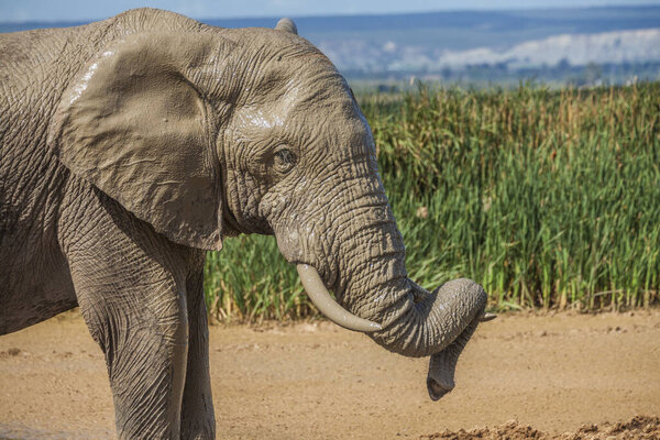 581878530 A closeup shot of an Elephant approaching a waterhole in the Savanna of South Africa