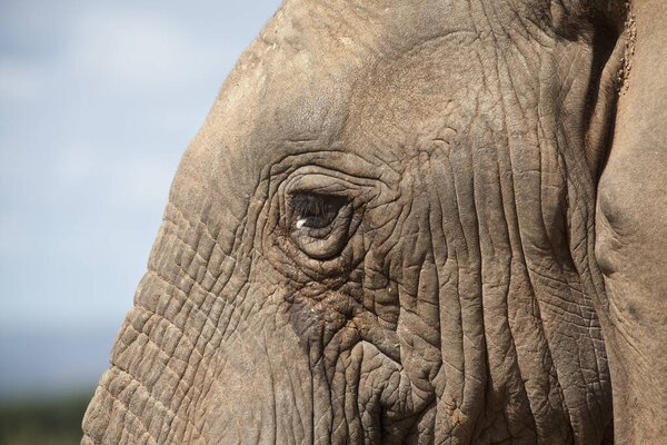 581995194 A closeup shot of an elephant face with wrinkled skin and its eye