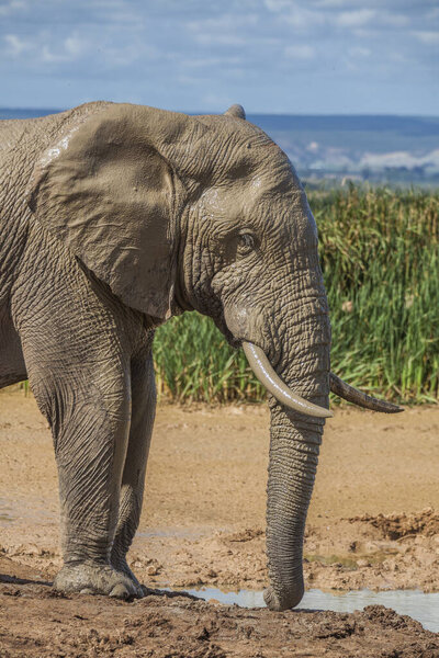 582034506 A vertical shot of an Elephant standing next to a waterhole in the Savanna of South Africa