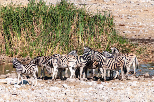 713588970 A group of Burchells Plains zebra -Equus quagga burchelli- drinking from a waterhole on the plains of Etosha National Park, Namibia.