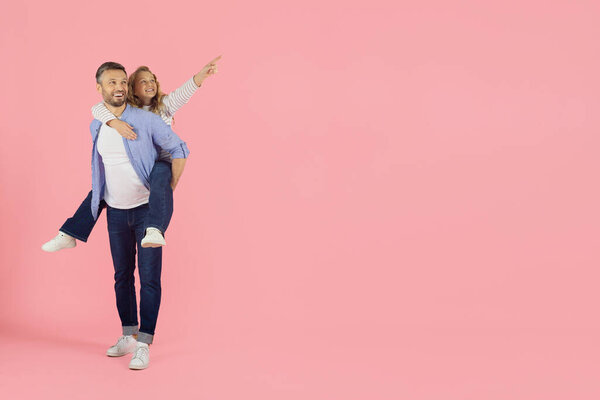 847283314 Father carrying daughter on back in studio, both smiling joyfully on pink background. Concept of love, protection, and playful family bonding