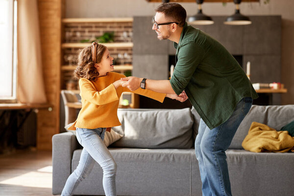 473564218 Having fun with daddy. Full leghth of cute excited little girl and young playful father in casual wear dancing and playing together while standing in living room at home. Family leisure activities
