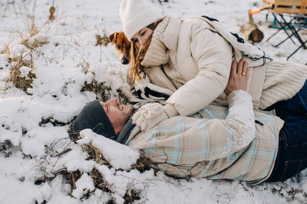 863442658 Loving dad and smiling daughter having fun lying in fresh winter snow with their pet dog. Family spending quality time
