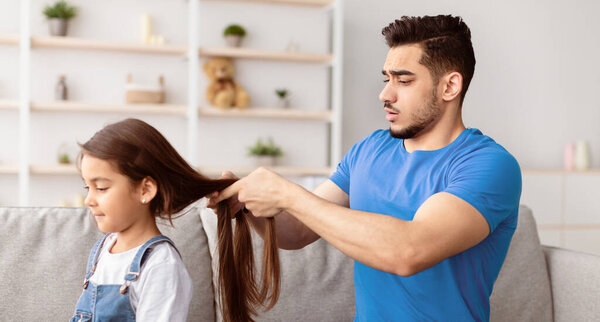 840883902 Portrait of young father making braid for his little daughter while sitting on the couch at home, man plaiting girls hair in the morning, doing hairstyle and feeling confused, preparing for school
