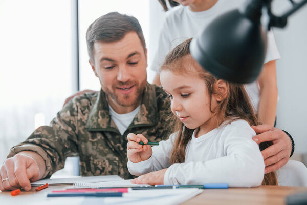 719469898 Learning new stuff and doing homework. Soldier in uniform is at home with his wife and daughter.
