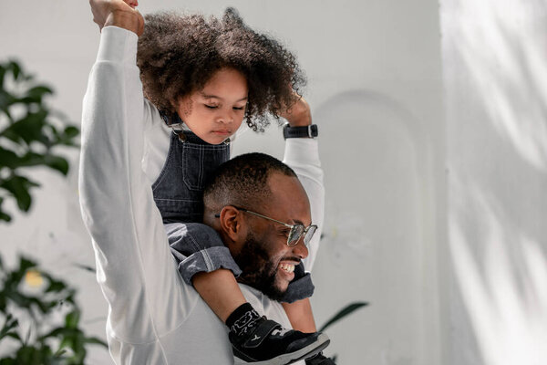 811561854 Happy family weekend. African american man playing with his little daughter, embracing on bed together, free space