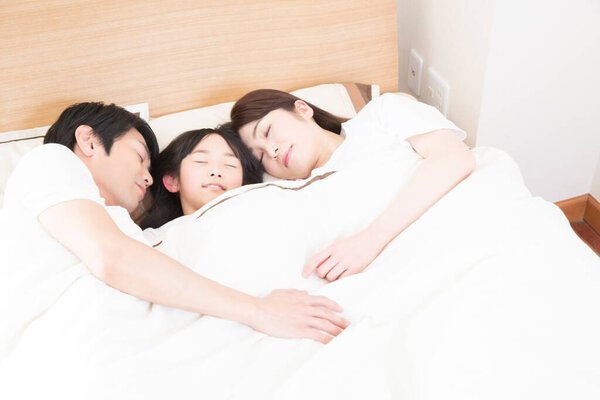 676544370 Asian cute three members family, father, mother, little daughter, sleeping in bedroom in comfortable bed together