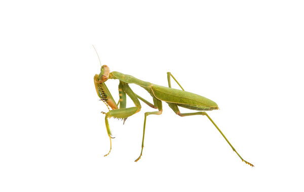 852203662 Green Mantis or Praying Mantis isolated on a white background. Mantis religiosa.